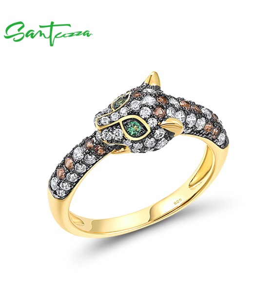 SANTUZZA 925 Sterling Silver Rings Nano Brown Spinel White CZ Leopard Ring Animal Jewelry