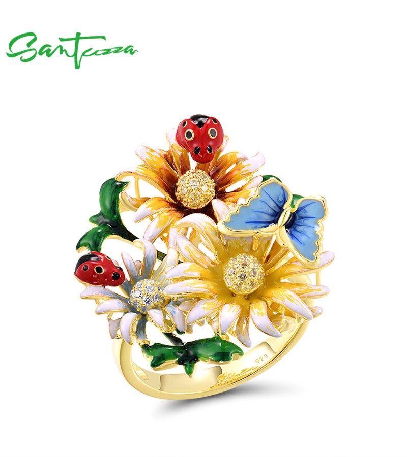 SANTUZZA 925 Sterling Silver Rings Yellow White CZ Enamel Flower Butterfly Fine Jewelry