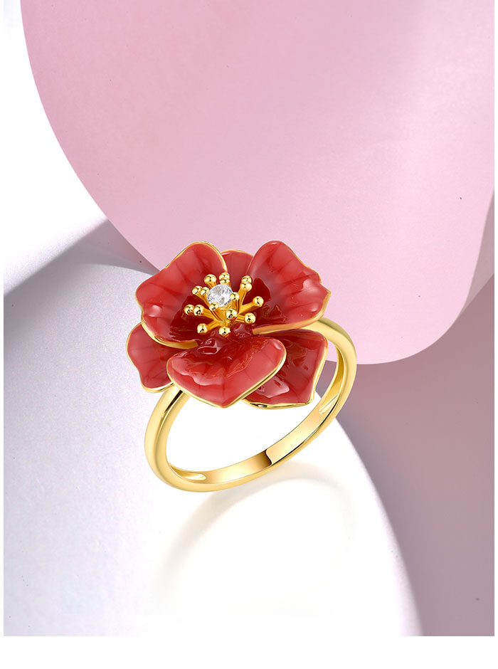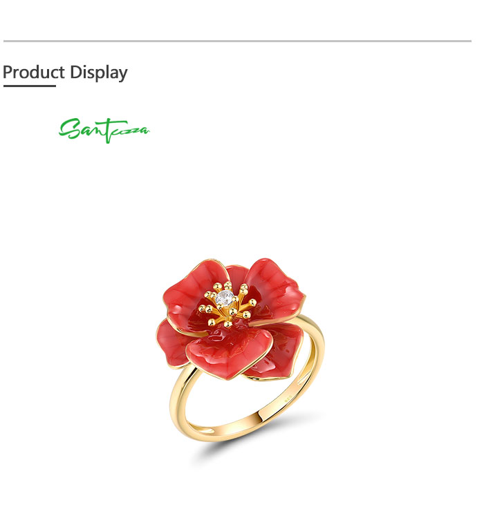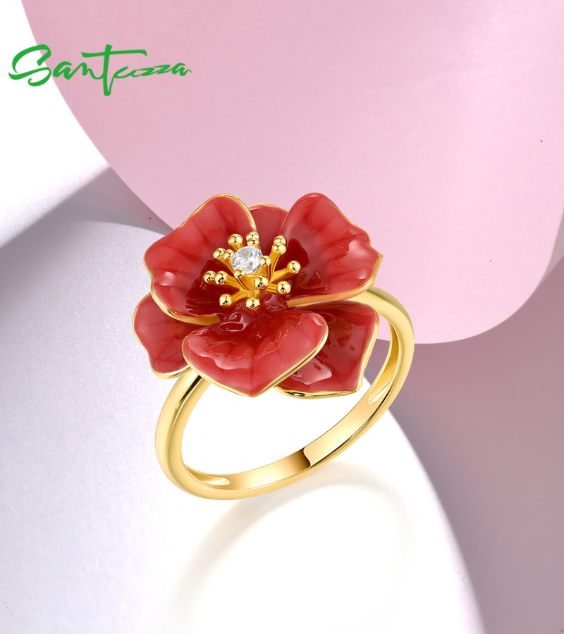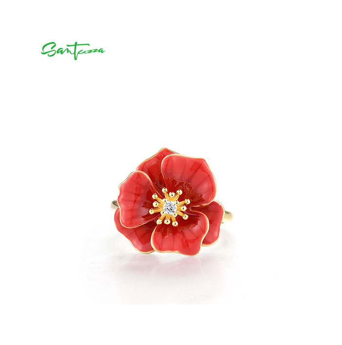SANTUZZA 925 Sterling Silver Rings White CZ Enamel Red Flower Delicated Fine Jewelry