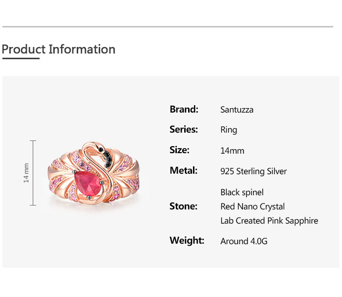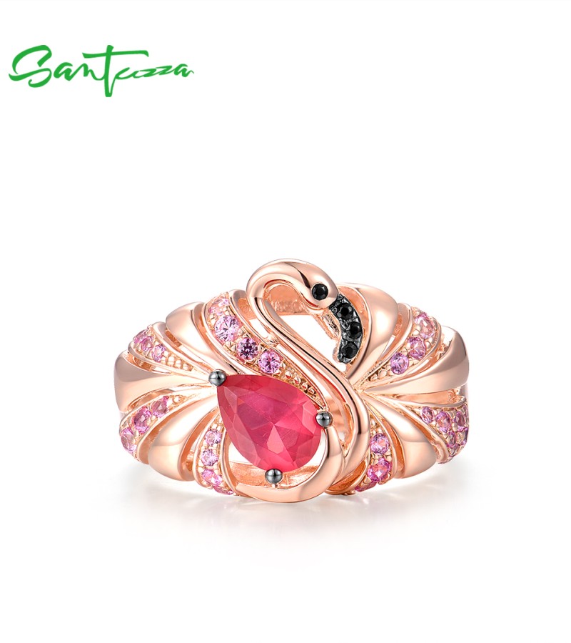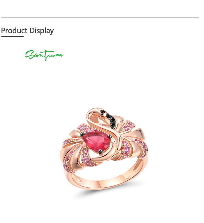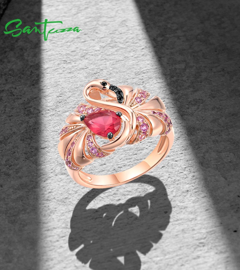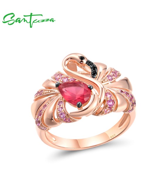 SANTUZZA 925 Sterling Silver Rings Red Stones Black Spinel Flamingo Rose Gold Color Jewelry