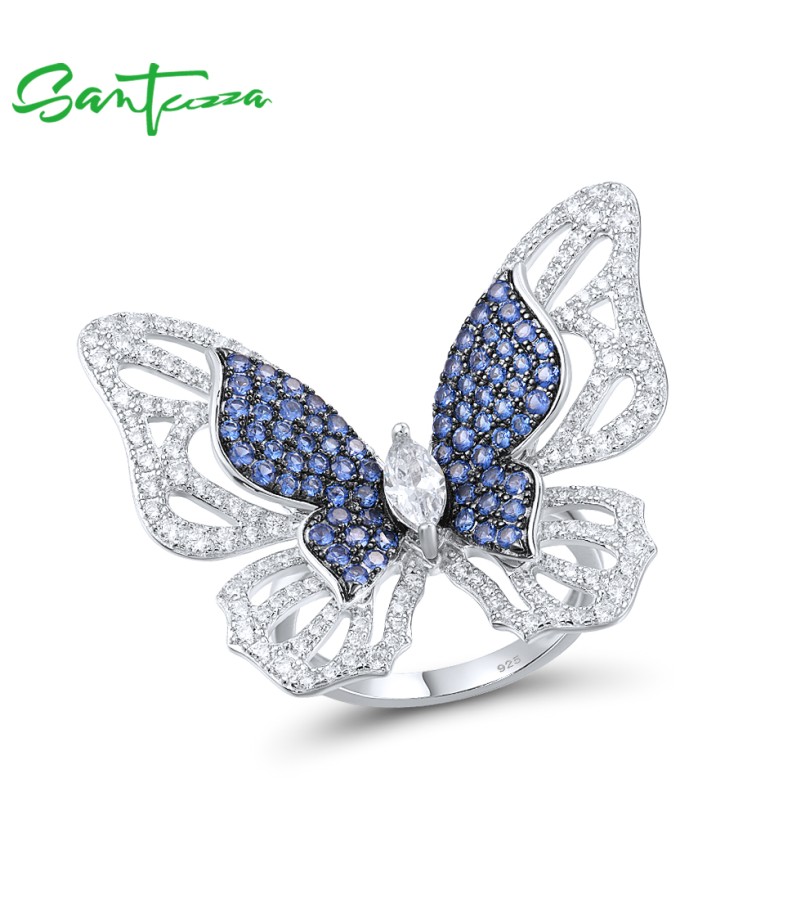 SANTUZZA 925 Sterling Silver Rings Blue Nano/White Cubic Zirconia Butterfly Ring Fine Jewelry