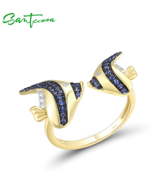 SANTUZZA 925 Sterling Silver Rings Blue White Cubic Zirconia Fish Adjustable Ring Fine Jewelry