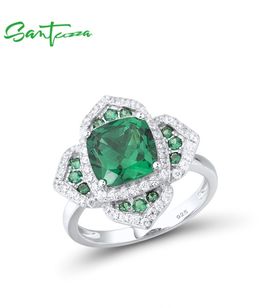 SANTUZZA 925 Sterling Silver Rings Square Green Spinel White CZ Flower Fine Jewelry