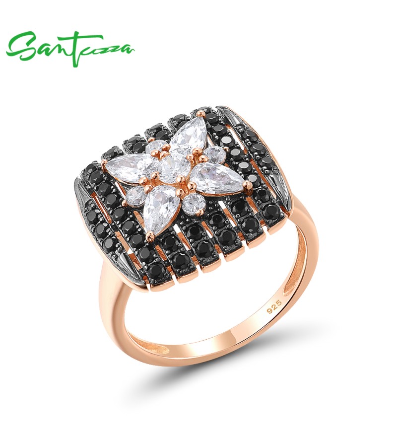 SANTUZZA 925 Sterling Silver Rings Black Spinel White CZ Star Fine Jewelry