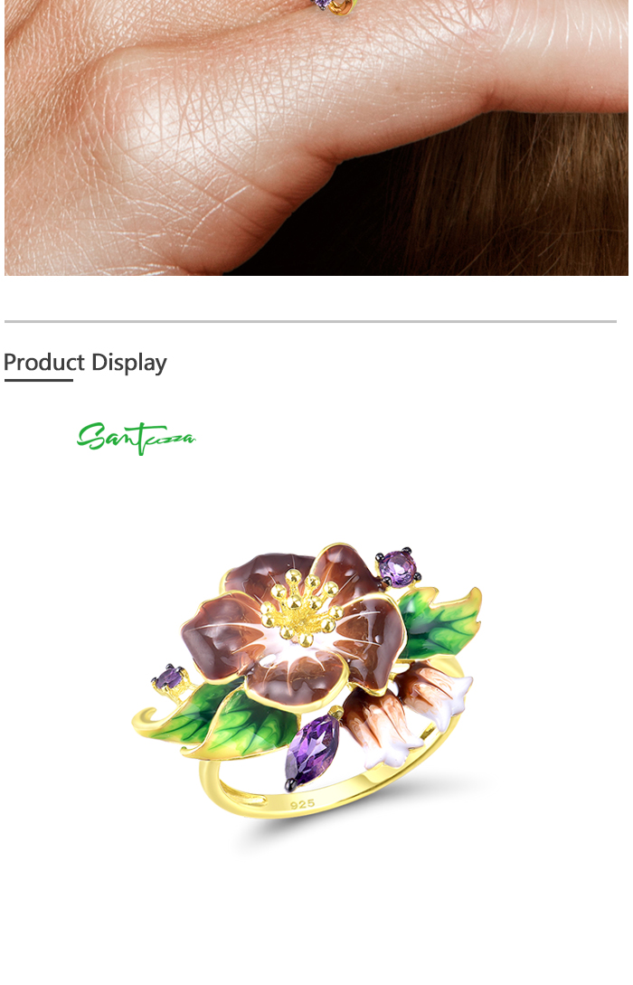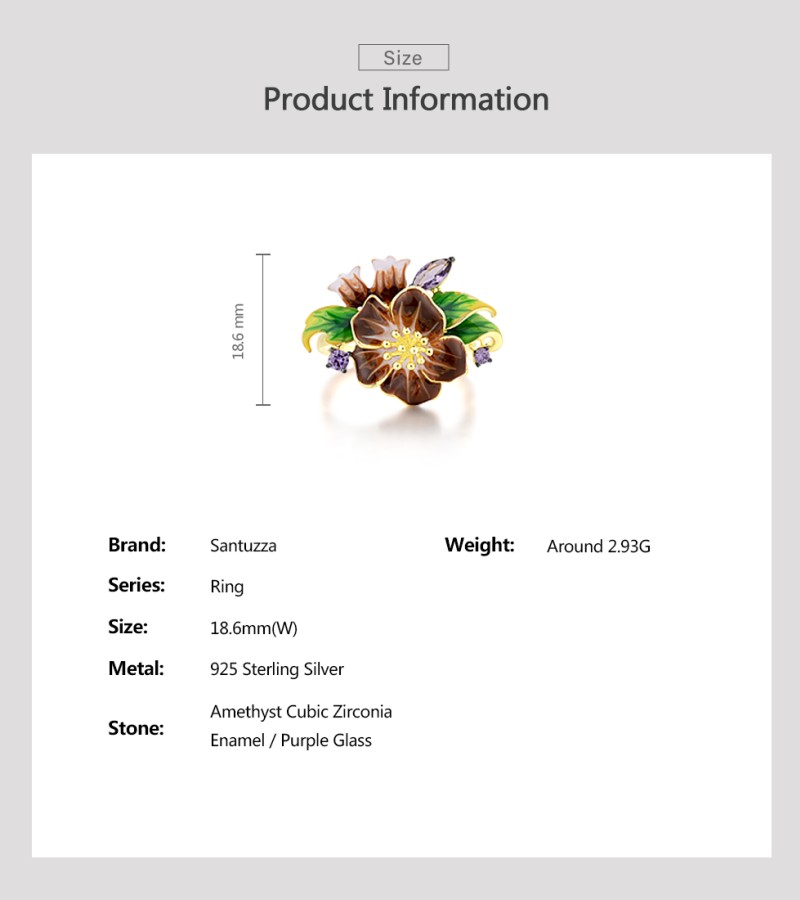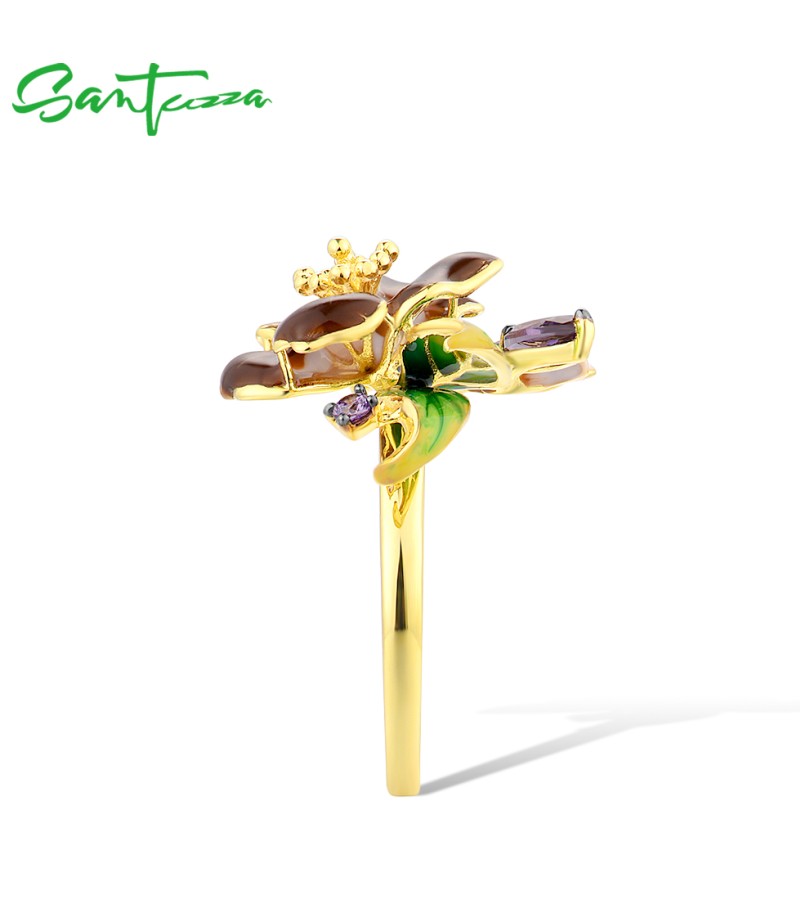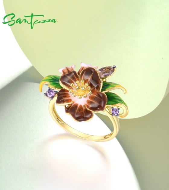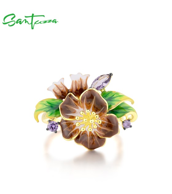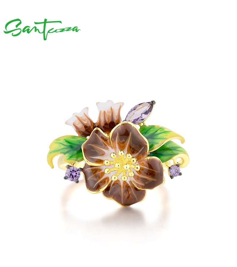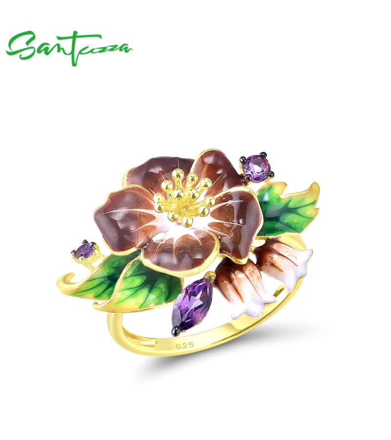 SANTUZZA 925 Sterling Silver Rings Brown Enamel Flower Amethyst CZ Fine Jewelry