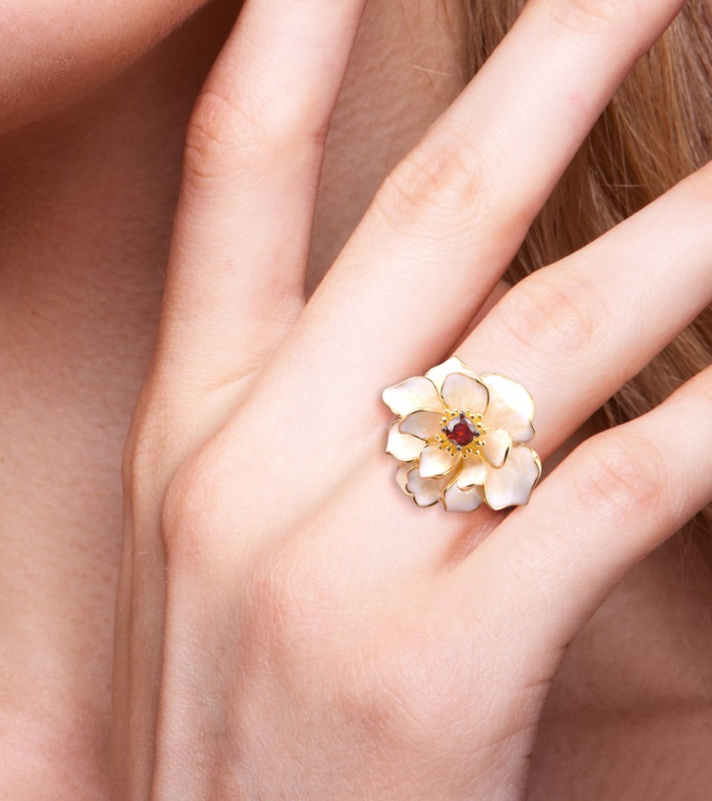 SANTUZZA 925 Sterling Silver Rings White Lotus Flower Garnet Jewelry Enamel - US 6.5