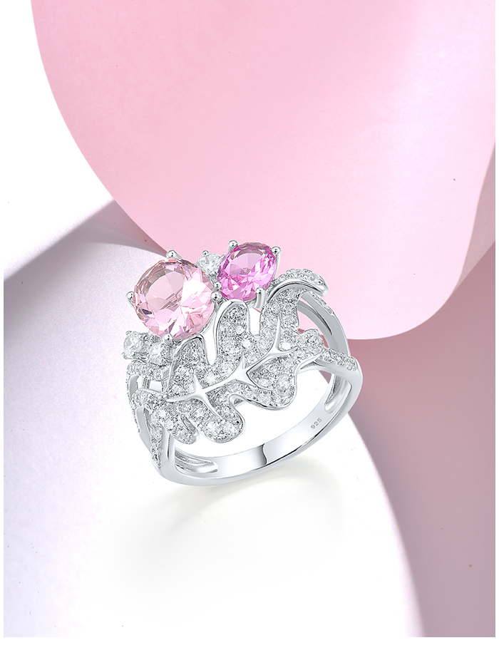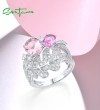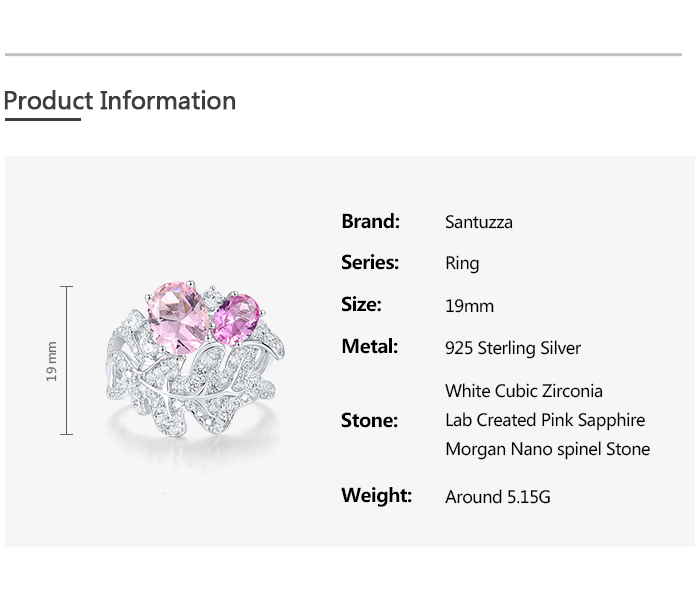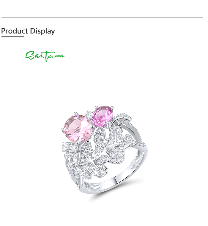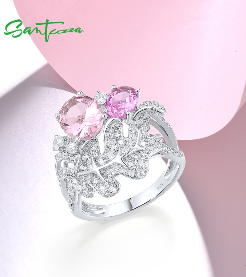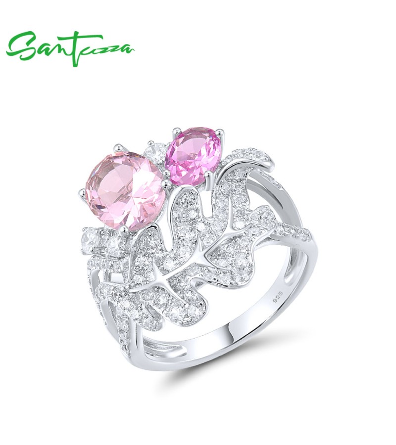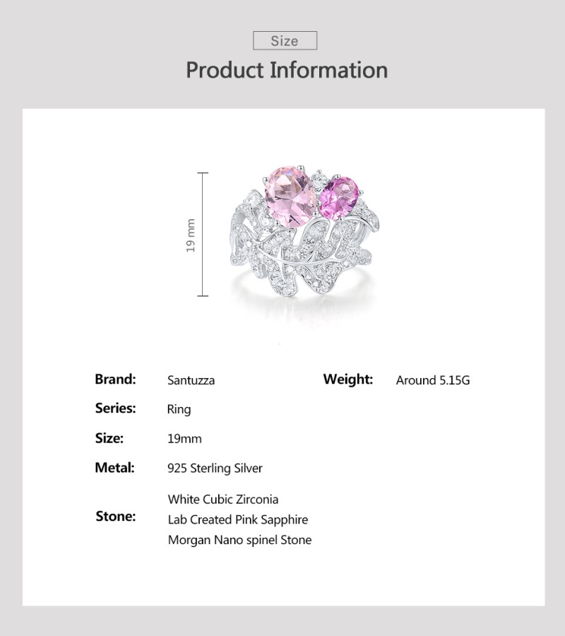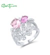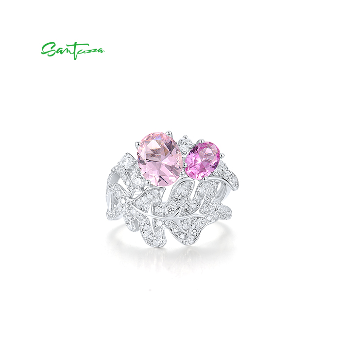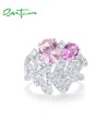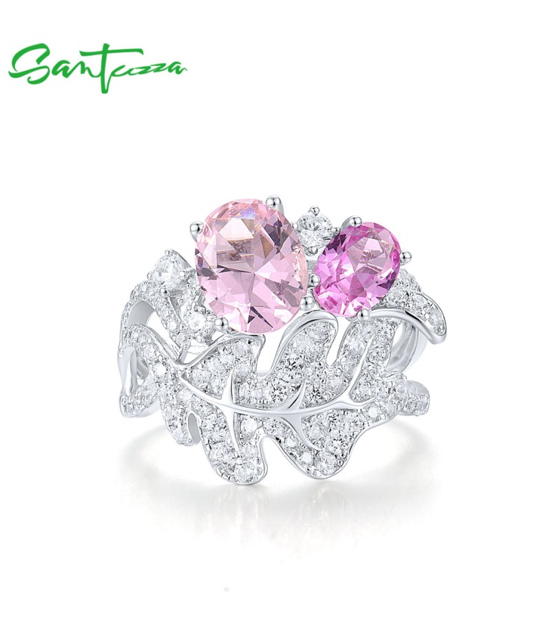 SANTUZZA 925 Sterling Silver Rings Created Pink Sapphire White CZ Leaf Ring Fine Jewelry