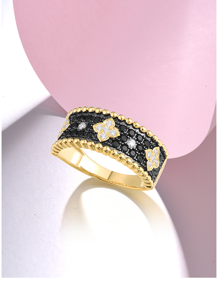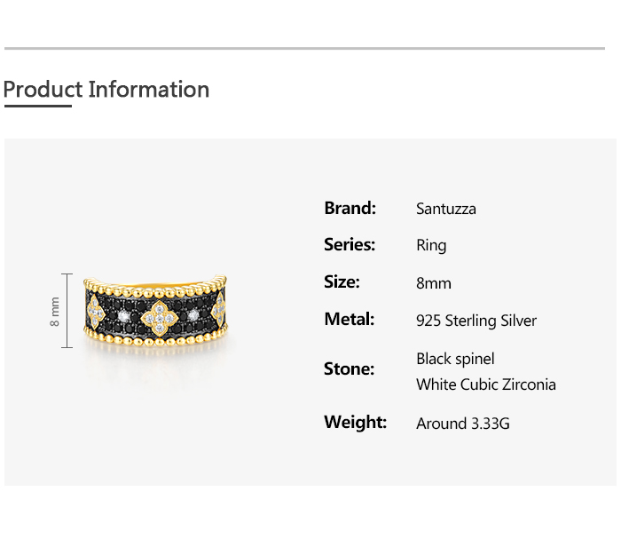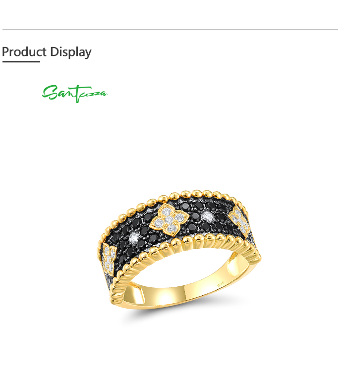 SANTUZZA Pure 925 Sterling Silver Ring For Women Sparkling Black Spinel White CZ Flower Antique Look Delicate Cute Fine Jewelry