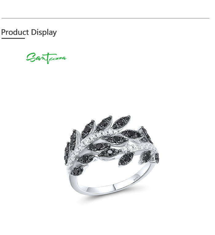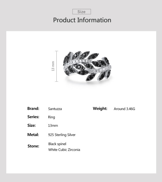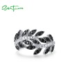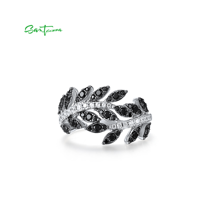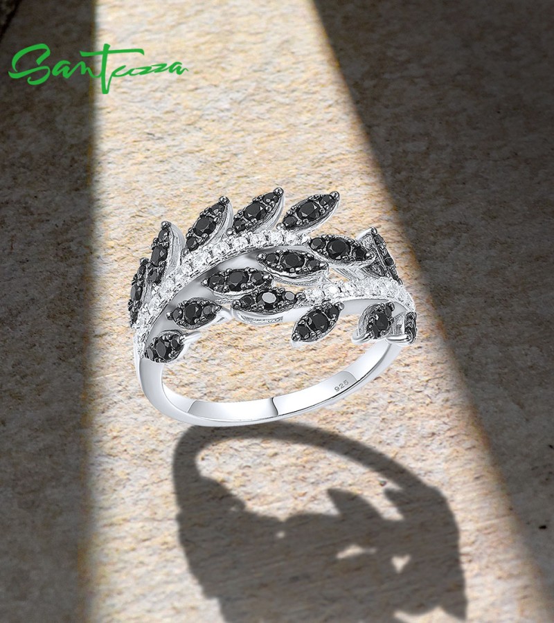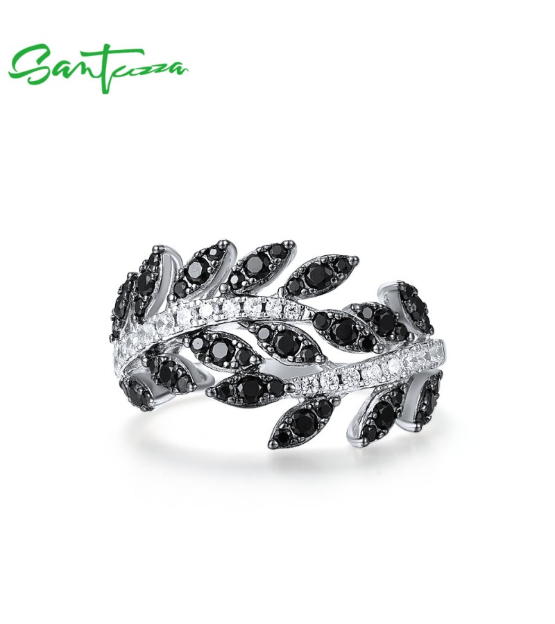 SANTUZZA 925 Sterling Silver Rings Black Spinel Leaf White Cubic Zirconia Plant Fine Jewelry